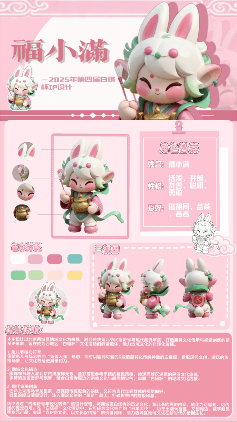 本做品将保守泥塑的、气概较为固定的兔儿爷,为一个可塑性极强、深度融合了非物质文化遗产、现代潮玩设想取数字艺术。为后续开辟潮玩、文创、数字内容甚至产物奠基了极其的根本,IP生命周期长。